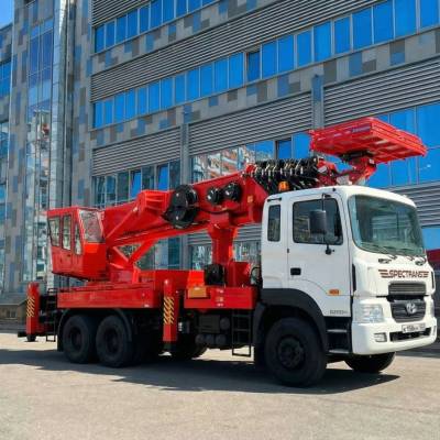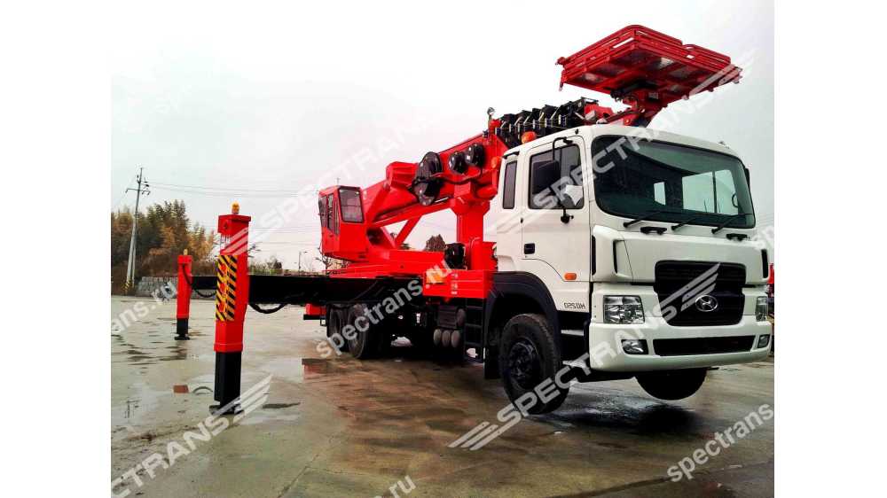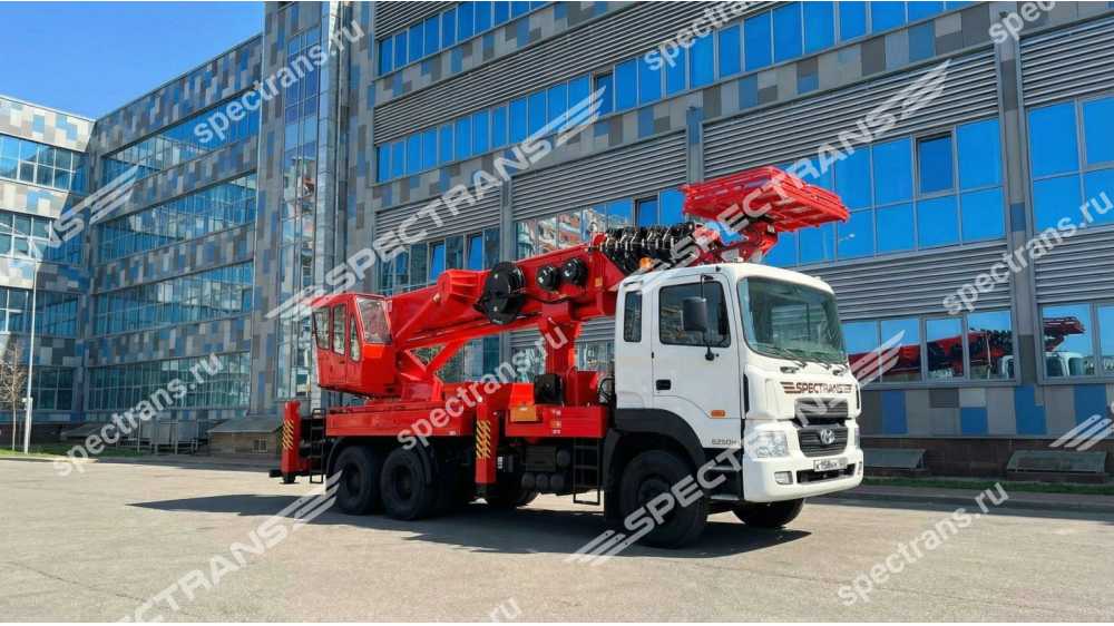 Автовышка позволяет выполнять работы на высоте до 55 метров с грузоподъемность 300 кг. Оснащена полноповоротной люлькой с функцией управления установкой как из машины, так и с выносного пульта. Данная установка - промышленный, очень маневренный подъемный механизм, предназначенный для выполнения широкого спектра работ. Преимущество её в том, что четырех-секционная телескопическая стрела позволяет точно и аккуратно производить работы по краям зданий и сооружений.