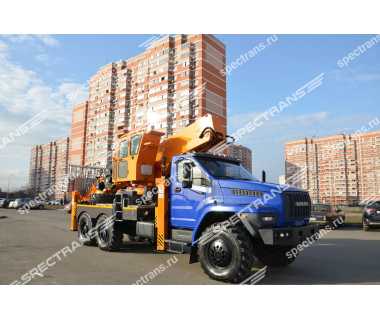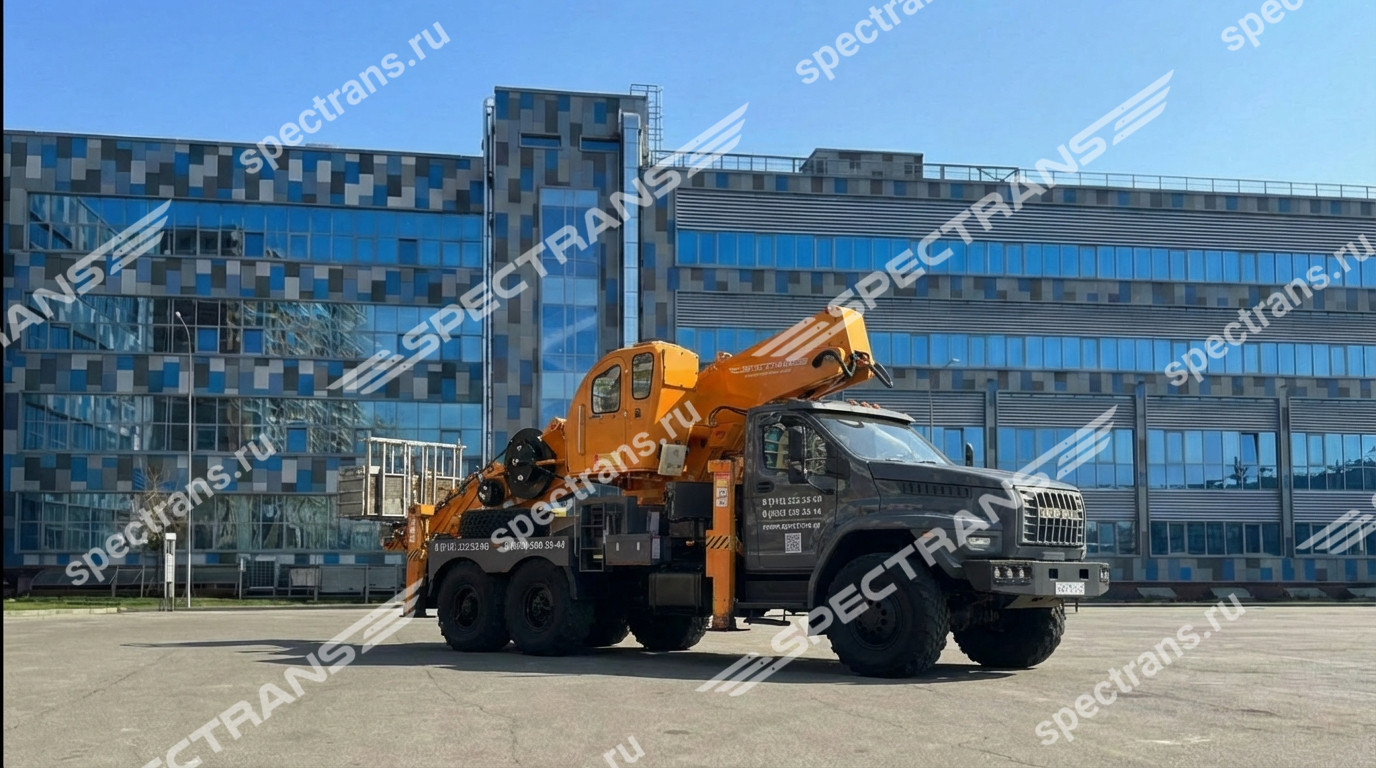 Автогидроподъемник на полноприводном шасси повышенной проходимости на базе URAL NEXT 6x6. Предназначена для работ на высоте в труднодоступных и труднопроходимых местах, таких как лесополосы, заболоченная местность и строительные объекты.